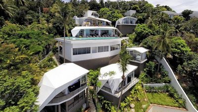Biệt thự này chủ yếu làm từ bê tông, cốt thép, khoác lên mình tông màu trắng sang trọng, phân chia các không gian nghỉ dưỡng theo dạng phân tầng. Các tầng nghỉ dưỡng kết nối với nhau qua hệ thống cầu thang kim loại hay bê tông. Nhìn từ trên cao, khu biệt thự