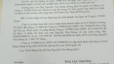 Liên quan đến việc tài xế tố cáo Grab, Cục thuế TP.HCM vừa gửi công văn cho hai bên xác nhận Grab đã đóng thuế thu nhập cho tài xế này. Công văn Cục thuế TP.HCM xác nhận Grab đã nộp thuế cho tài xế Nguyễn Văn Hưng. Cụ thể, vào ngày 1/8/2019, Cục thuế