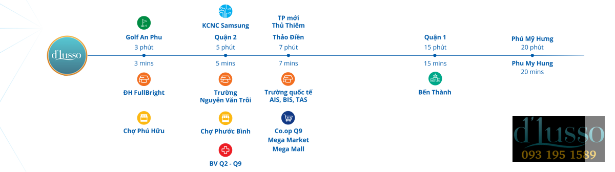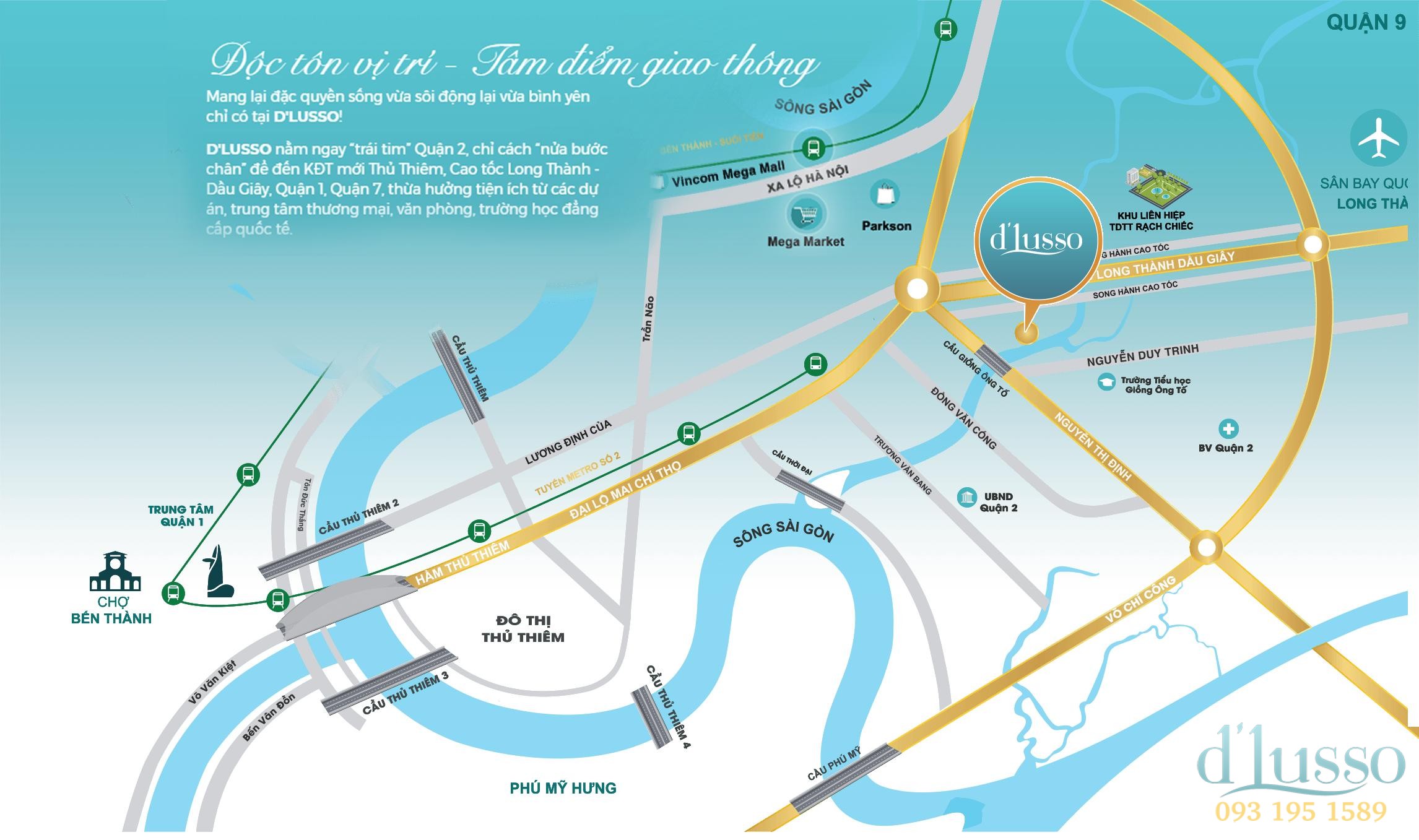 Tại D'Lusso Emerald, chủ nhân có thể dễ dàng kết nối với các vùng khác trong khu vực. Căn hộ D'Lusso liền kề các dự án nổi bật trong khu vực như Palm Heights, Homyland 1, 2, 3 (Riverside), Centana Thủ Thiêm, The Estella Heights...cùng nhiều dự án căn hộ cao cấp khác trong khu vực.
