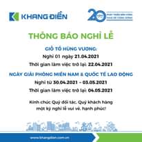 May be an image of text that says 'K KHANG ĐIỀN năm PHÁT TRIỂN BÉN VỮNG CHIA SE CỘNG ĐỐNG THÔNG BÁO NGHỈ LỄ GIá TỔ” HÙNG VƯƠNG: Nghỉ 01 ngày 21.04.2021 Thời gian làm việc trở lại: 22.04.2021 NGÀY GIẢI PHÃNG MIỀN NAM & QUỐC TẾ LAO ĐỘNG Nghỉ từ 30.04.2021 03.05.2021 Thời gian làm việc trở lại: 04.05.2021 Kính chúc Quý đối tác, Quý khách hàng một kỳ nghỉ lễ vui vẻ, hạnh phúc! 和 www.khangdien.com.vn'